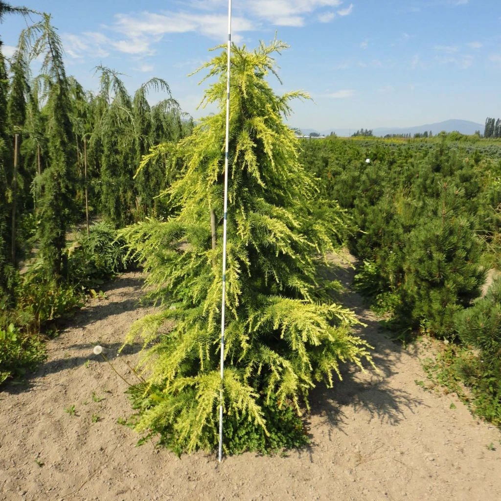 Le Cedrus deodara ‘Aurea’, plus connu sous le nom de cèdre de l’Himalaya doré, se distingue de l’espèce par sa croissance plus modérée et lente, ainsi que par son feuillage printanier lumineux. Il présente un beau port pyramidal et des branches étagées aux extrémités légèrement pleureuses. Idéal pour les jardins de taille moyenne où il deviendra en l’espace de quelques années l’une des plantes vedettes.